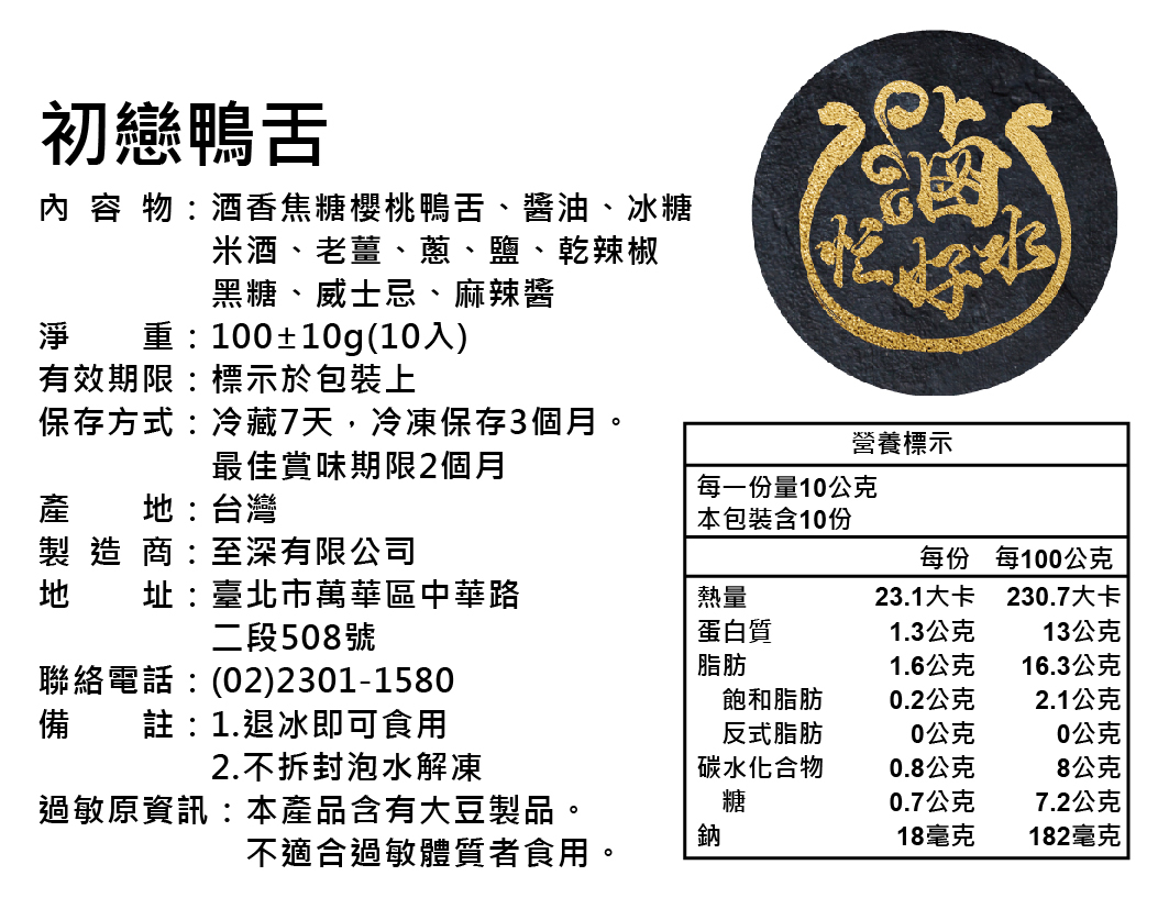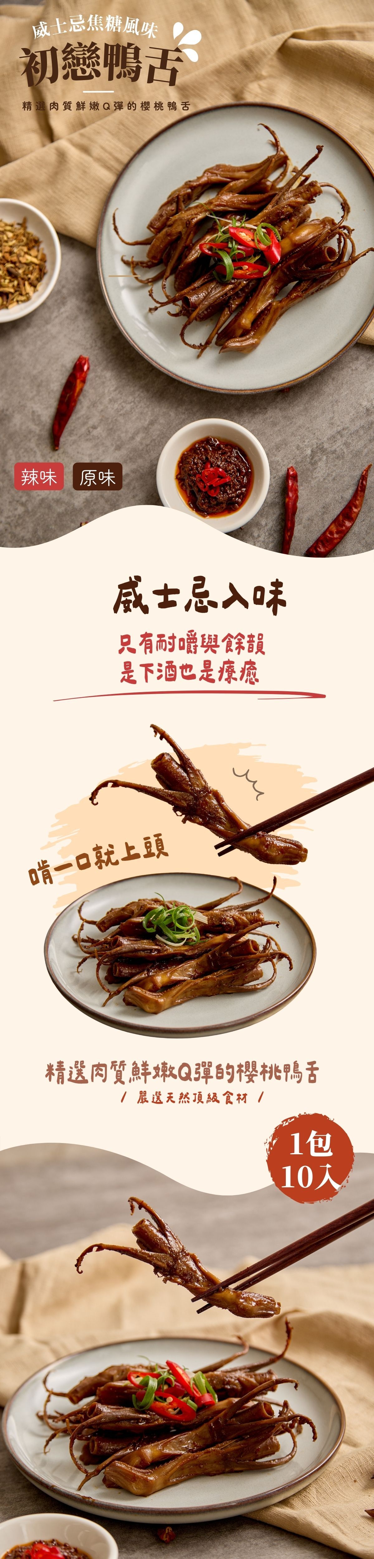成份:櫻桃鴨舌,醬油、冰糖、米酒、老薑、蔥、鹽、乾辣椒、黑糖、威士忌、麻辣醬、雞心辣椒(辣味)