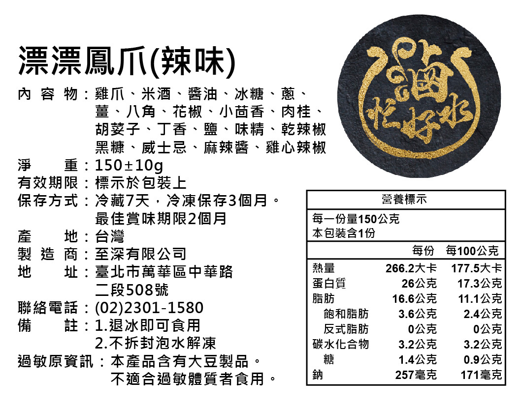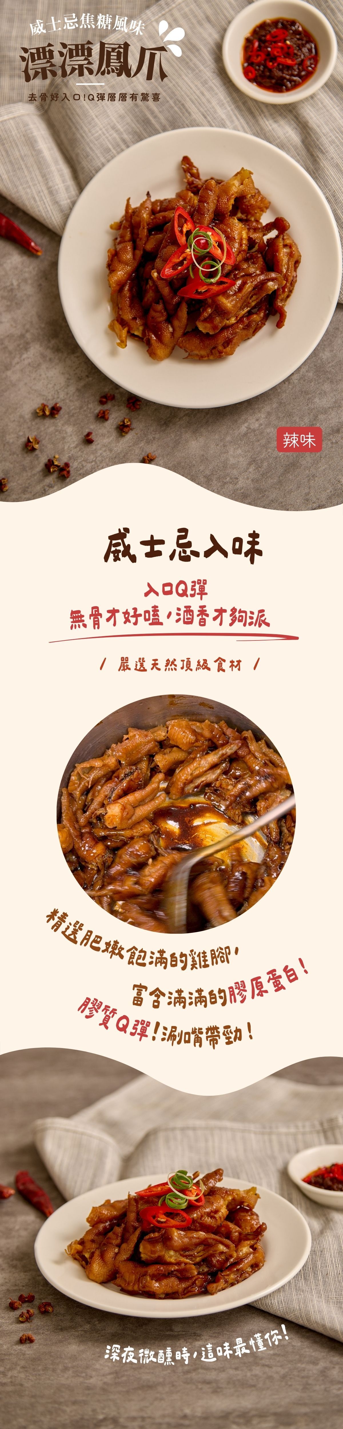 成份:雞腳、醬油、冰糖、米酒、老薑、蔥、鹽、乾辣椒、黑糖、威士忌、麻辣醬、雞心辣椒(辣味)