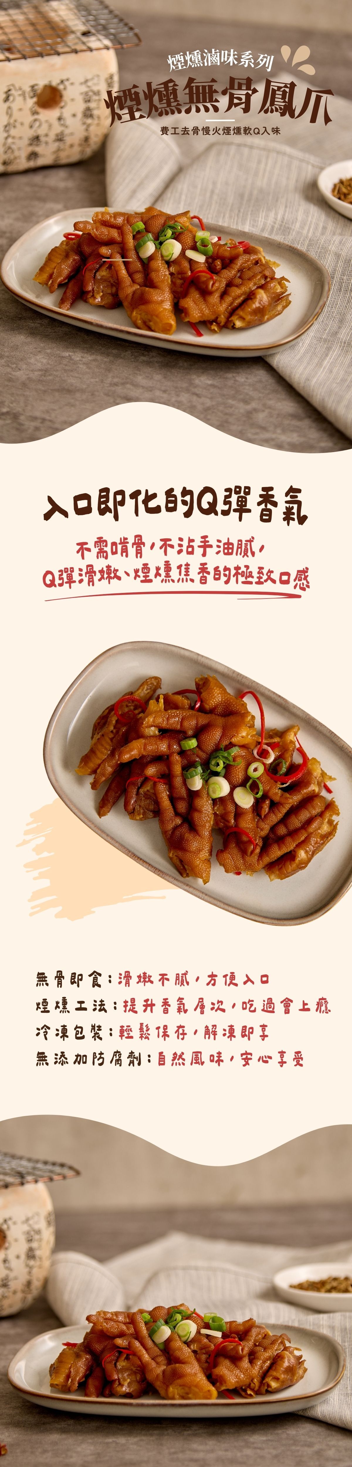 無骨鳳爪有煙燻香,嘴饞必備不沾手!嚴選雞爪去骨處理,經長時間低溫煙燻,